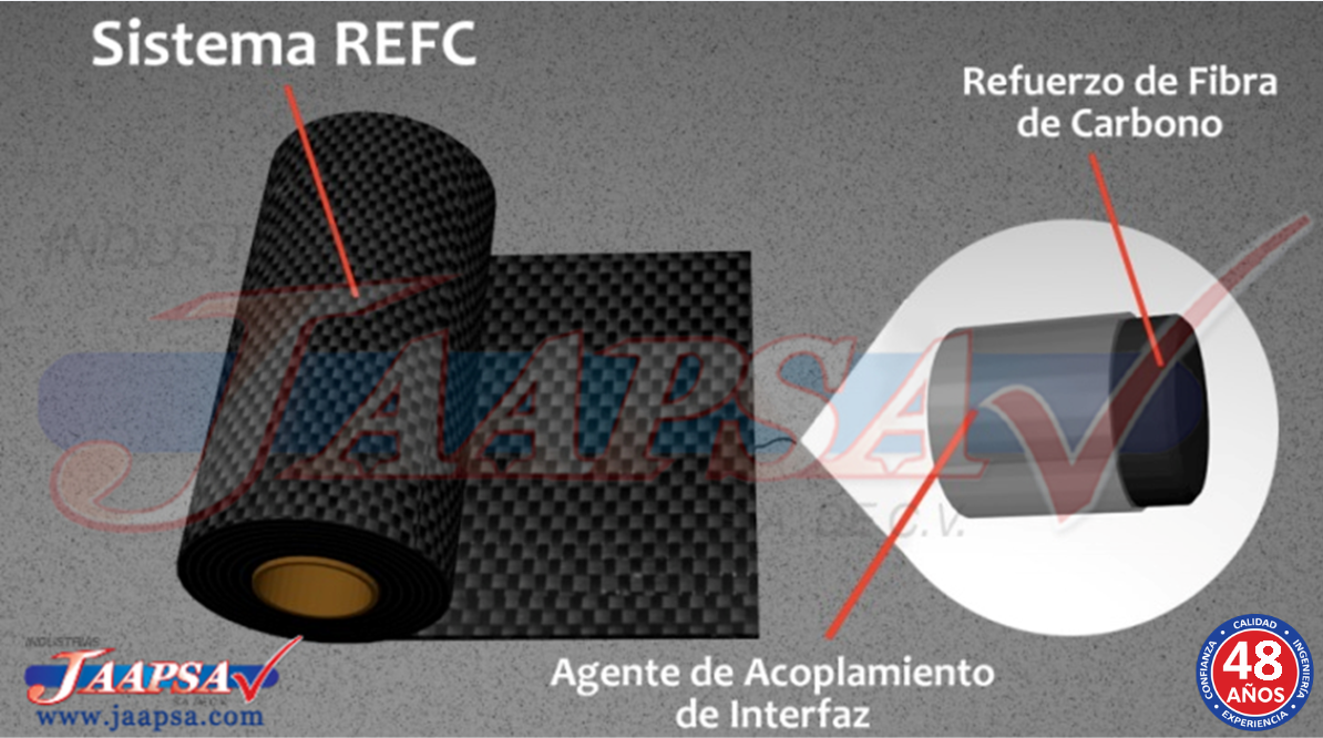 El componente principal del sistema REFC es la fibra de carbono. Las fibras vienen tejidas en forma de una tela flexible la cual se adhiere a la superficie de la estructura a reparar al humedecerla con una fórmula de resina epoxy estructural.
